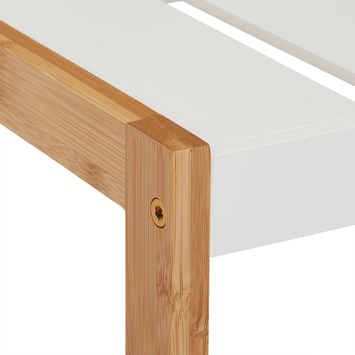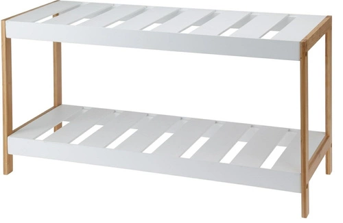 Regał na buty wykonany z wysokiej jakości bambusa i MDF z certyfikatem FSC 100%, co świadczy o zastosowaniu materiałów pochodzących z odpowiedzialnych źródeł. Jego wymiary to 70x26x36 cm, co czyni go idealnym rozwiązaniem do przechowywania butów w przedpokoju, sypialni lub innych pomieszczeniach. Regał charakteryzuje się eleganckim designem, łącząc białe półki z naturalnymi bambusowymi nogami, co dodaje mu świeżości i lekkości. Konstrukcja w stylu knock down ułatwia transport i montaż, co sprawia, że jest wygodny w użytkowaniu.To praktyczne i stylowe rozwiązanie, które pomoże w zachowaniu porządku w obuwiu, jednocześnie stanowiąc dekoracyjny element wnętrza.