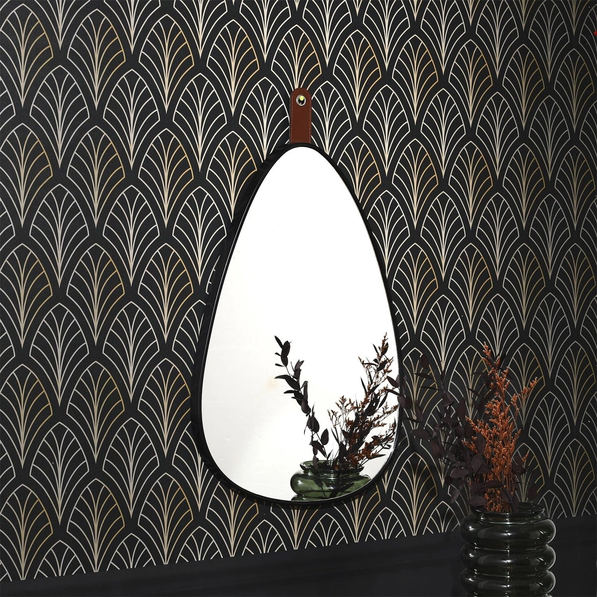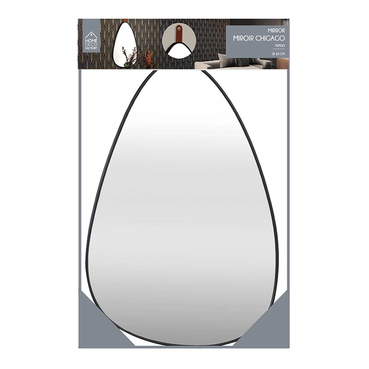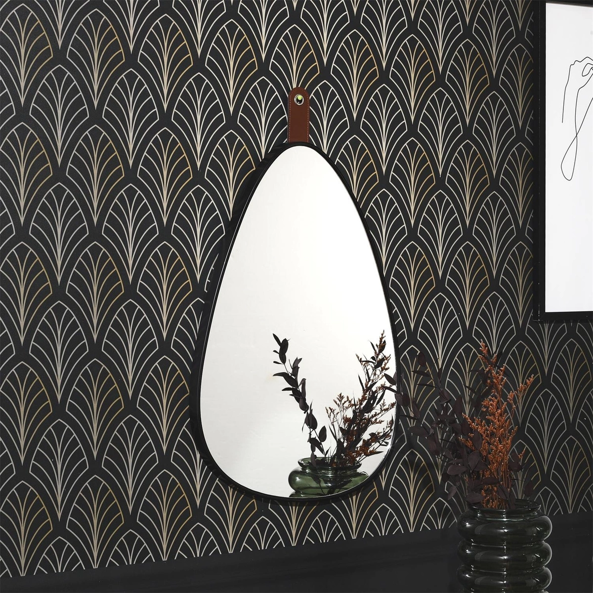 Lustro o nieregularnym kształcie ozdobi ścianę przedpokoju lub sypialni. Lustro w czarnej ramie wyposażone zostało w ozdobny cuhwyt za pomoca którego możemy przymocowac je na ścianie. Wykonane ze szkła oraz tworzywa sztucznego.