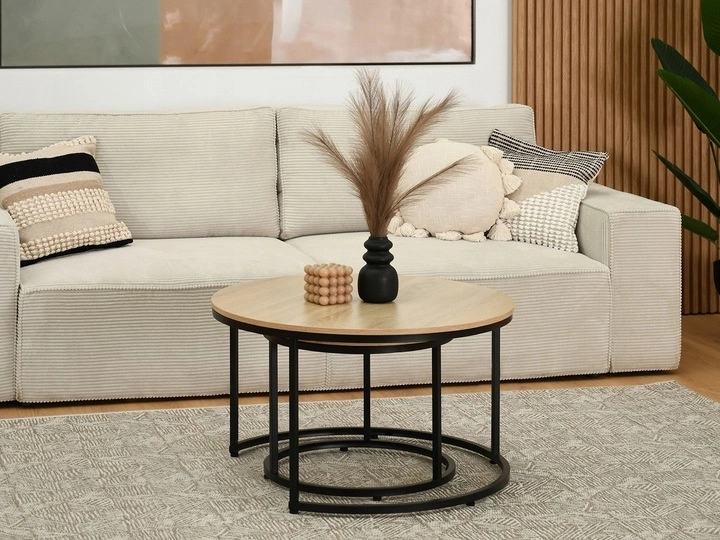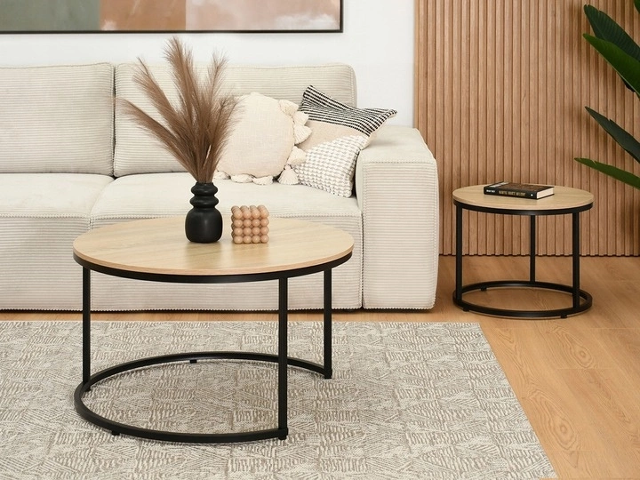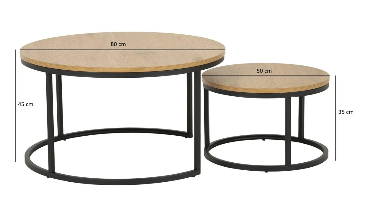 Zestaw dwóch stolików kawowych sprawdzi się w salonie aktywnej rodziny. Zestaw dwóch stolików, które możemy używać zestawione razem lub całkiem oddzielnie. Stoliki gdy nie są potrzebne możemy włożyć jeden pod drugi, uzyskując przy tym więcej miejsca w salonie do naszych aktywności. Stoliki wykonane zostały z blatu z płyty MDF w papierowej okładzinie imitującej drewno dębu oraz metalowej, malowanej proszkowo podstawy. Okrągłe stoliki wyposażone zostały w stopki z tworzywa, dzięki czemu są bezpieczne dla naszej podłogi. Wymiary dużego stolika: 80x80x45cm, Wymiary mniejszego stolika: 50x50x35cm Maksymalne obciążenie na jeden stolik 40kg Wymaga montażuPotrzebujesz pomocy? Masz pytania?Zadaj pytanie a my odpowiemy niezwłocznie, najciekawsze pytania i odpowiedzi publikując dla innych.