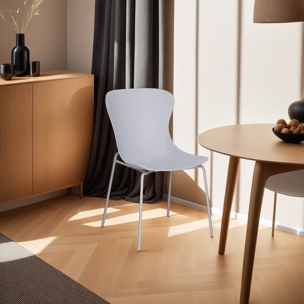 Minimalistyczne krzesło Diapo to połączenie zaoblonego siedziska z wytrzymałego tworzywa sztucznego oraz metalowej podstawy o ponadczasowej konstrukcji. Siedzisko krzesła wykonane zostało z jednego kawałka tworzywa. Odpowiednio wyprofilowane gwarantuje wygodne użytkowanie przez długie godziny podczas rodzinnych spotkań. Podstawą krzesła są cztery nogi malowane proszkowo. Nogi zakończone zostały stopkami z tworzywa sztucznego, dzięki czemu krzesło nie tylko nie ślizga się, ale również nie rysuje podłogi. Materiały: siedzisko z tworzywa, podstawa metalowa lakierowana proszkowo. Nie sztapluje się Wymaga montażu Maksymalne obciążenie 120kg Max. 2 sztuki w kartonie. Wymiary kartonu: 54x52x62 cm