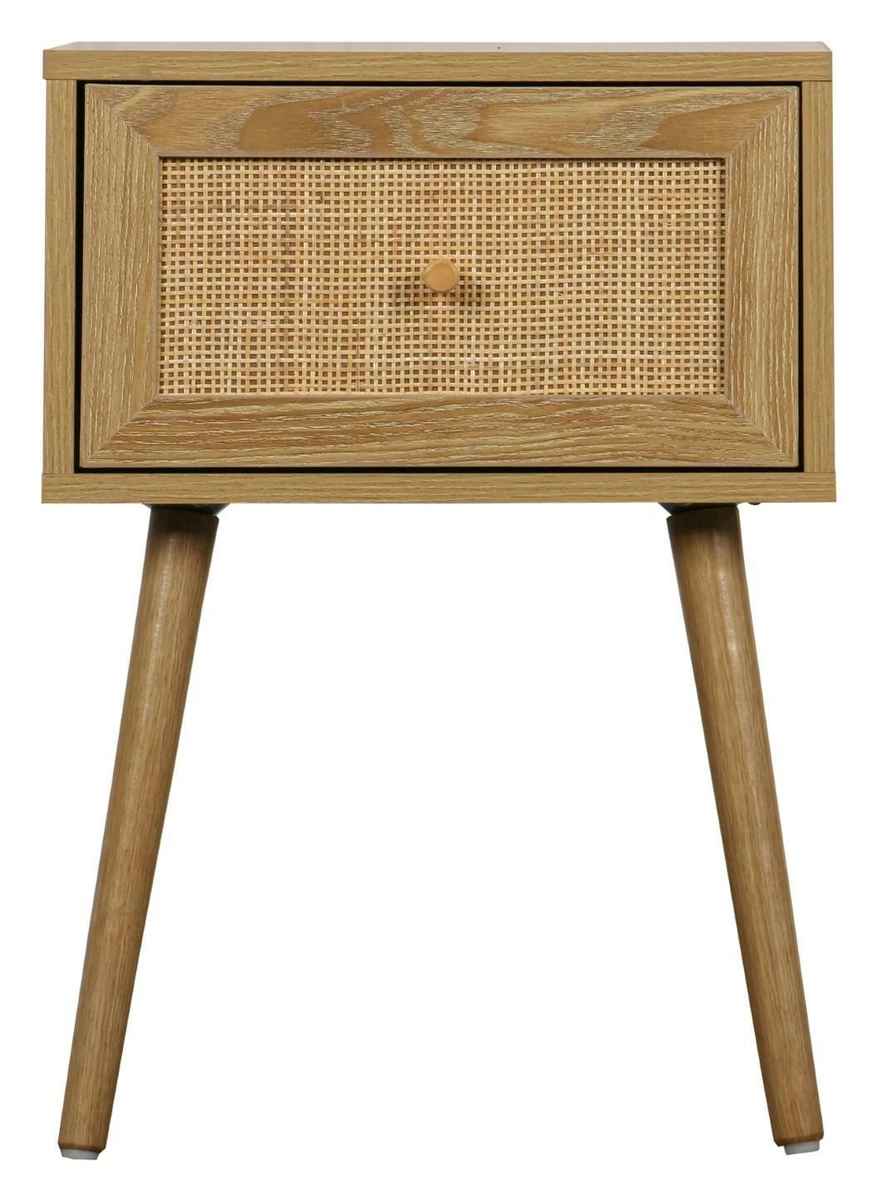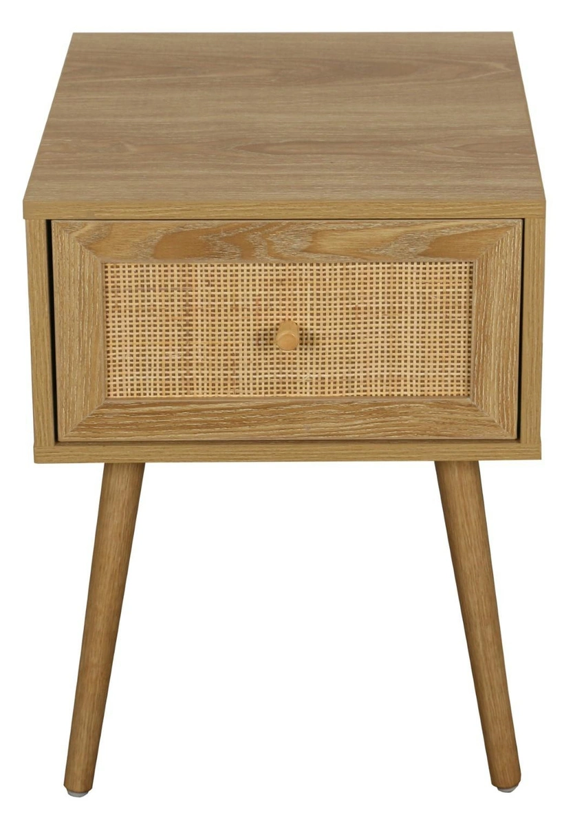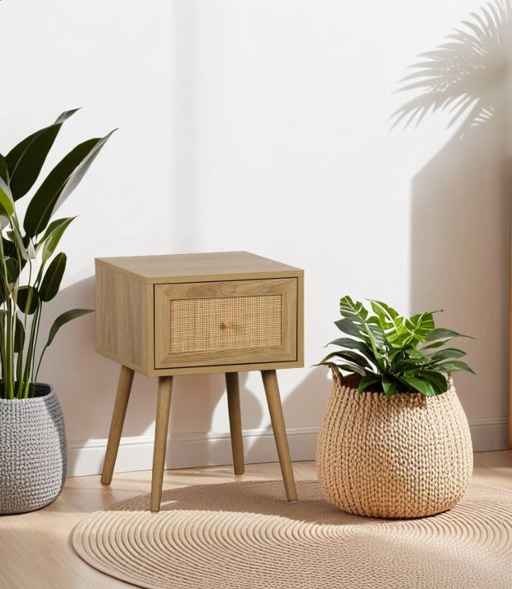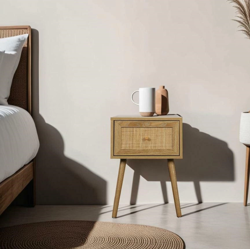 Szafka nocna z serii Ballo to nowoczesny mebel w naturalnym stylu boho. Minimalistyczna konstrukcja ozdobiona naturalnymi materiałami jak rattan czy lite drewno sprawdzi się we wnętrzu spójnym z naturalnymi kolorami. Jasna szafka o ciepłym odcieniu drewna idealnie sprawdzi się w beżowym wnętrzu. Materiał korpusu: płyta wiórowa laminowana papierowym laminatem imitującym naturalny kolor dębu. Nogi komody wykonane z litego drewna sosnowego. Rattanowa dekoracja frontów. Szuflada szafki otwiera się dzięki metalowym kulkowym prowadnicą. Wymaga montażu. Maksymalne obciążenie mebla 30 kg. Wymiary kartonu: 45x15x45cmPotrzebujesz pomocy? Masz pytania?Zadaj pytanie a my odpowiemy niezwłocznie, najciekawsze pytania i odpowiedzi publikując dla innych.