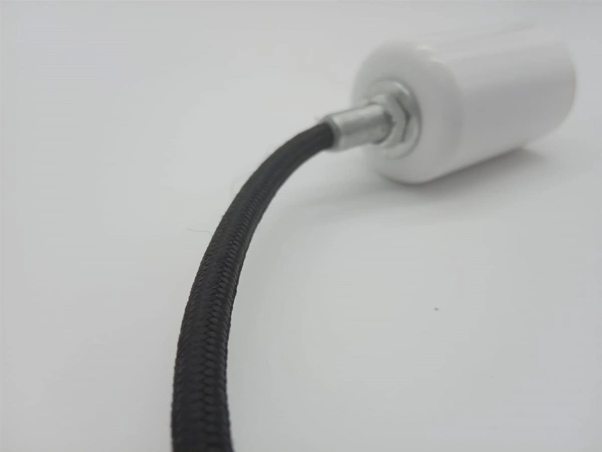Zawieszona na czarnym kablu w sznurkowym oplocie.